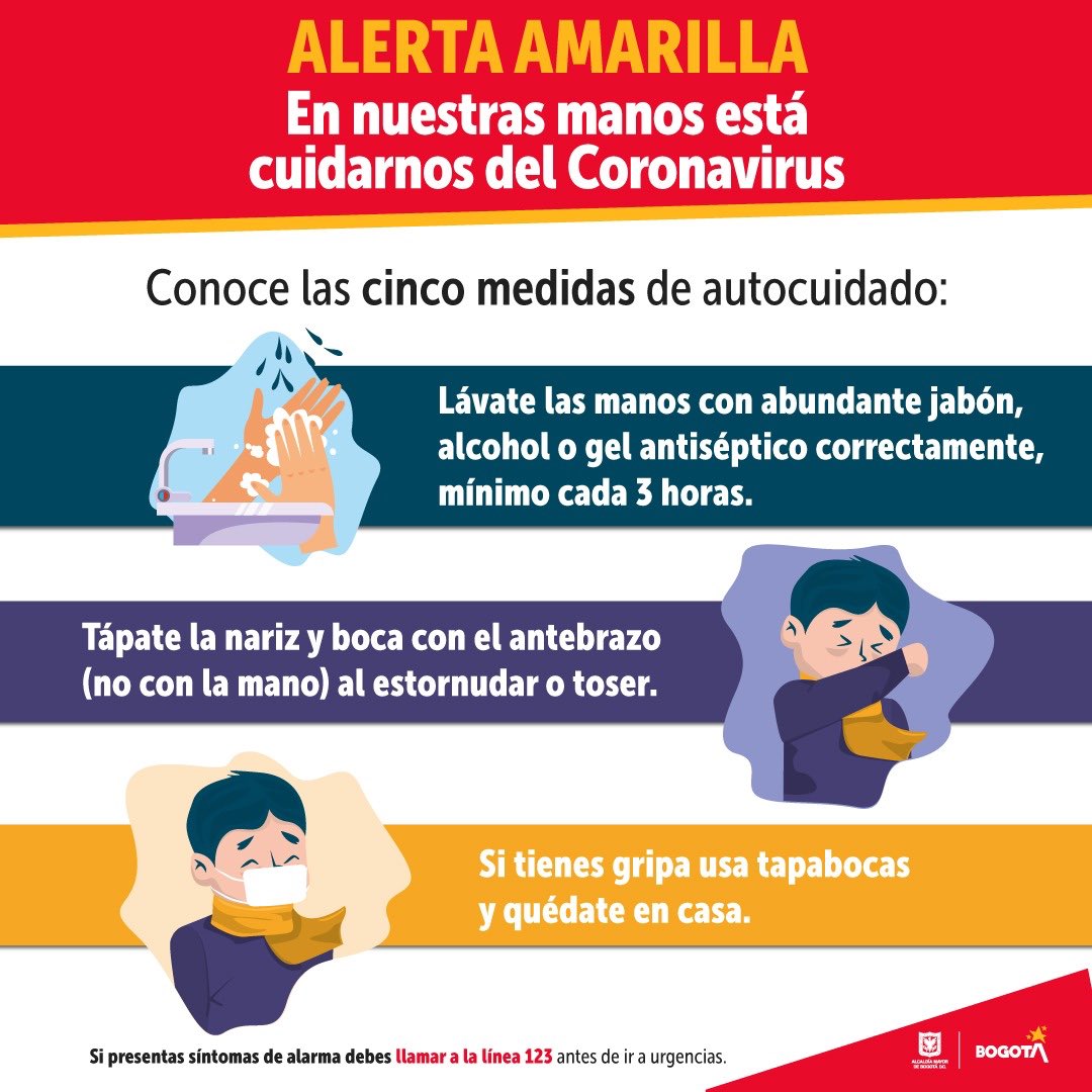 Alerta Amarilla Bogota. De acuerdo con las medidas preventivas que ha venido tomando la Alcaldía de Bogotá para enfrentar el coronavirus la Alcaldesa de Bogotá Claudia López Hernández declaró la Alerta Amarilla en la ciudad con una serie de medidas de prevención autoprotección y cuidado colectivo frente al virus. Lavarse las manos 2.